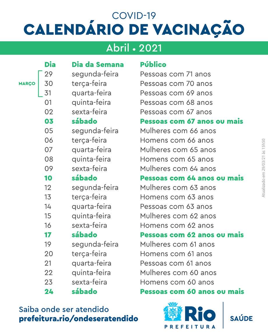 No dia 16 vamos estar vacinando as pessoas com 37 anos, o que estava previsto só para o dia 4 de agosto, disse paes. A prefeitura do rio de janeiro informou em nota um novo calendário para aplicação da segunda dose da coronavac. A previsão é que todos adultos sejam vacinados com ao menos uma dose até 18 de agosto. Primeira dose para homens e mulheres de 36 anos. Prefeitura de araruama vai realizar dia d de conscientização sobre os riscos do coronavírus no bairro rio do limão 15/07/2020.